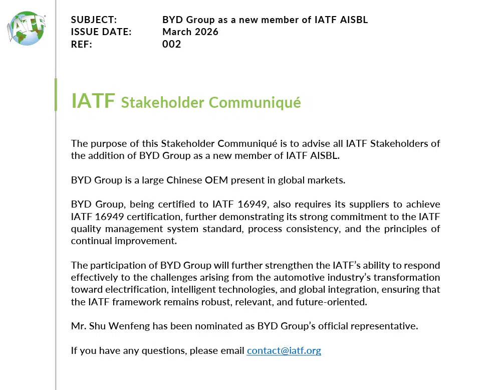 BYD Company Limited , maailmanlaajuinen johtava toimija uusienergiaajoneuvot (NEVs) , on virallisesti liittynyt Kansainväliseen autoalan tehtäväryhmään (IATF) , mikä on merkittävä askel kiinalaisten automerkkien osalta kansainvälisten autoalan standardien määrittelyssä. BYD:n ehdotti Autoteollisuuden toimintaryhmä (AIAG) ja IATF:n jäsenet hyväksuivat yksimielisesti BYD:n ehdokkuuden, jolloin BYD osallistuu yhdessä sellaisten suuryritysten kanssa kuin Volkswagen ja General Motors keskitettyjen kansainvälisten autoalan standardien muokkaamiseen.
